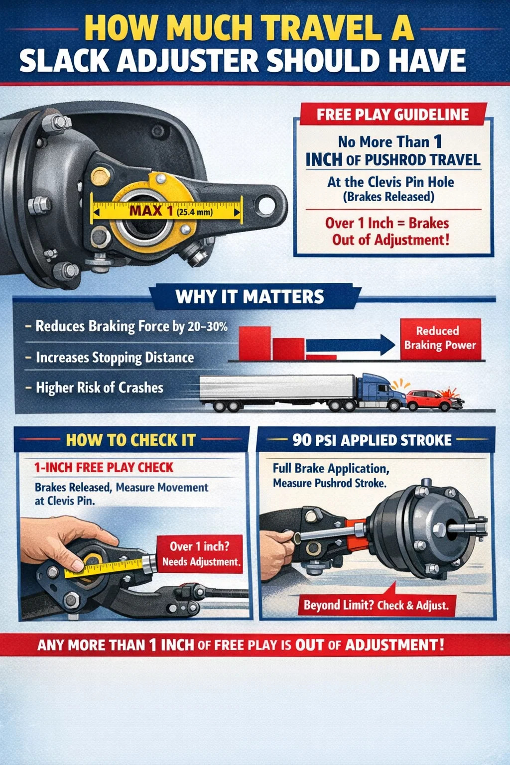 Prieskum FMCSA a American Trucking Associations Technical and Maintenance Council (TMC) to neustále dokazujú jedna neregulovaná brzda na ťahači môže predĺžiť brzdnú dráhu až o 25 % . Keď sú viaceré nápravy nesprávne nastavené – čo je bežné, keď bola údržba odložená – brzdná dráha sa môže predĺžiť o 40 % alebo viac. Plne naložené vozidlo s hmotnosťou 80 000 libier pri rýchlosti 60 míľ za hodinu už potrebuje takmer 300 stôp na zastavenie za ideálnych podmienok. Nárast tejto vzdialenosti o 40 % pridáva 120 stôp, čo je pri rýchlostiach na diaľnici rozdiel medzi takmer neúspechom a kolíziou.