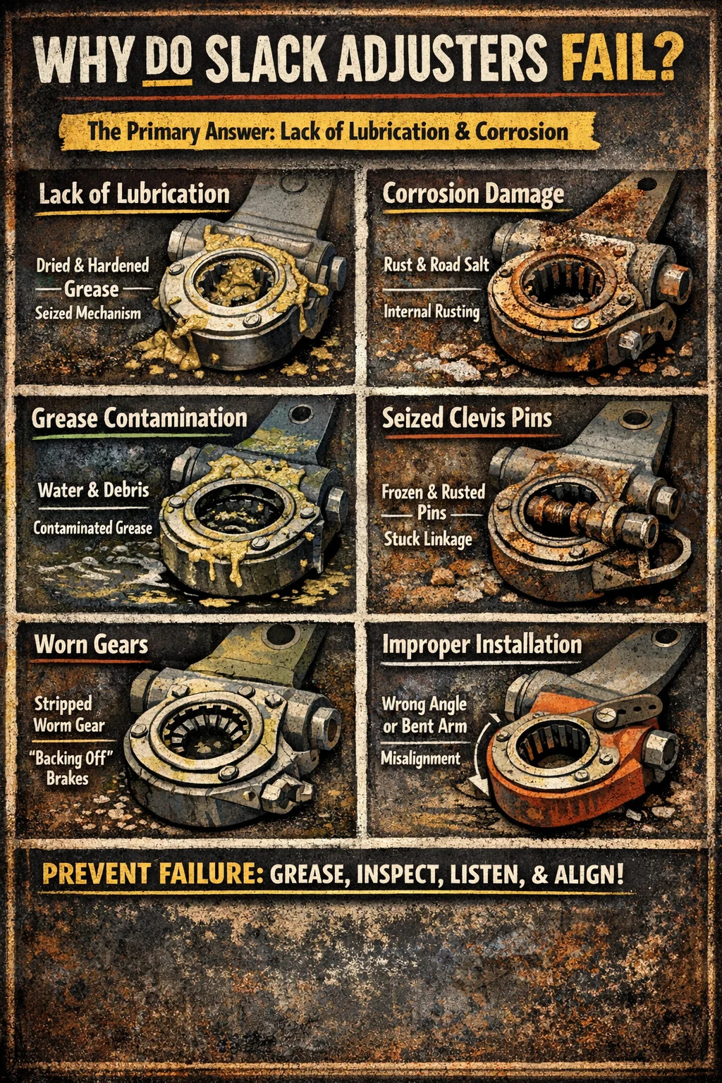 Vo veľkej väčšine prípadov nastavovače vôle zlyhávajú kvôli nedostatku bežného mazania a environmentálnej korózii. Pretože sú tieto komponenty umiestnené na spodnej strane podvozku, sú neustále bombardované cestnými úlomkami, vodou a žieravými rozmrazovacími chemikáliami. Keď vnútorné mazivo vyschne alebo sa znečistí, jemný vnútorný rohatkový mechanizmus sa zadrie alebo opotrebuje, čo bráni komponentu v automatickom nastavení vôle brzdových čeľustí. Sekundárne príčiny zahŕňajú vnútorné mechanické opotrebenie ozubených kolies a nesprávnu inštaláciu riadiaceho ramena.
